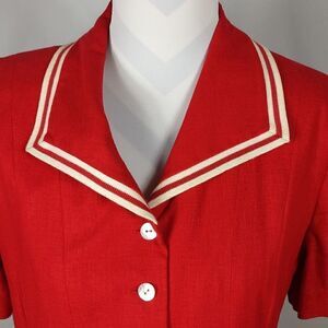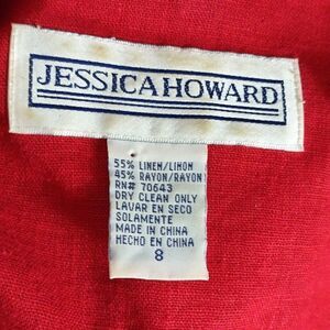 This vintage red short sleeve button down Jessica Howard maxi dress is a size 8 with a pit to pit measuring 20" with a length of 52". Has shoulder pads and ties in back. 55% linen 45% rayon. Pre-owned and in excellent condition. All offers welcome.