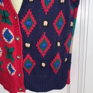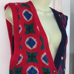 Vintage 90s Robert Scott, Ltd red, green, tan & blue ramie/cotton sweater vest