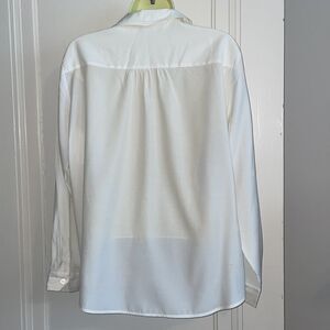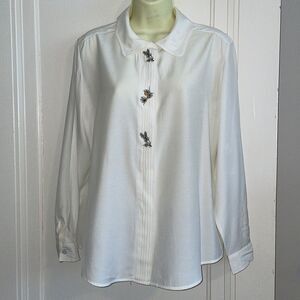 Vtg 90s Susan Bristol New Traditions petites white long sleeved rayon blouse with pine needle & pine cone embroidery & pleating on front