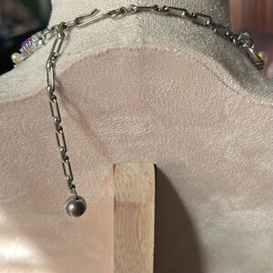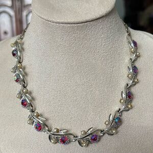 Vtg AB Crystal Choker Necklace Silver-tone Blue Aurora Borealis & Pearl Beads