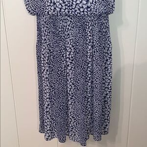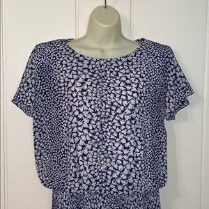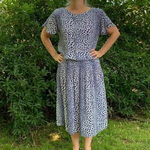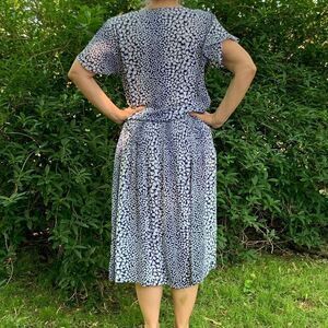 Vintage 80s Alison Peters “bow” design navy blue & white polyester blouson dress