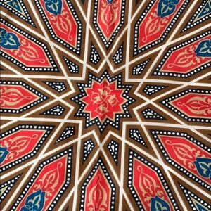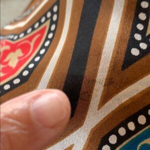 Unique Anne Klein Mandela design on silk, hand rolled edges. Very good condition with a slight small, pictured, stain, and one pin hole,not at all noticeable with so much design.
