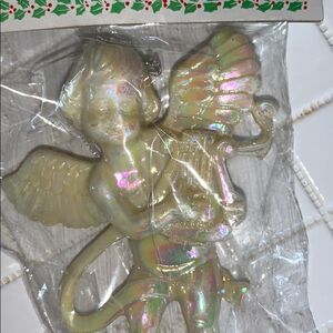 Vintage Ardco ivory pearlized angel playing harp Christmas ornament in original packaging