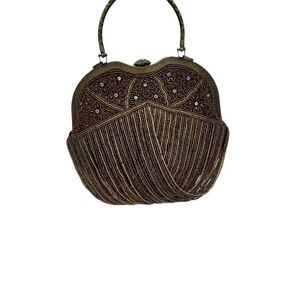 Vtg Baguette Formal Beaded Fringe Framed Kiss Closure Top Handle Bronze