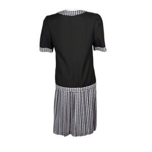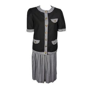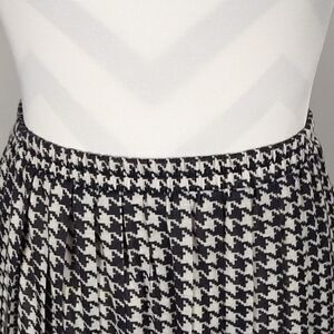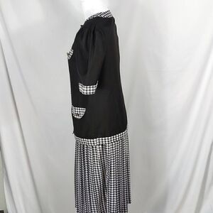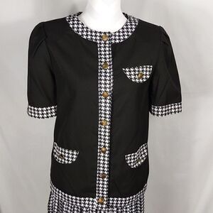 This vintage black and white houndstooth 2 piece short sleeve skirt suit is a size 8 with a pit to pit measuring 19". Skirt has an elastic waistband which measures 28" and length is 27". Top buttons down and has three faux pockets. Top has shoulder pads. 65% polyester 35% rayon and machine washable. Pre-owned and in excellent condition. All offers welcome.