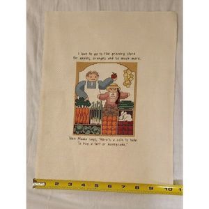 Vtg FINISHED CROSS STITCH Needlepoint Girl and Clerk Market Scene quote 13"