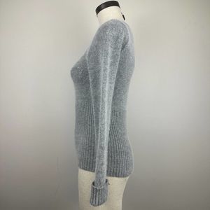 Crafted with impeccable attention to detail, this luxurious angora/lambswool blend sweater features a delicately textured gray-colored knit stitch that effortlessly hugs your silhouette.