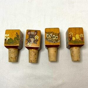 Vintage Hand Painted Wood Bottle Stoppers. Set of 4. Owl, Mushroom, Mice, Turtle. Very good condition.