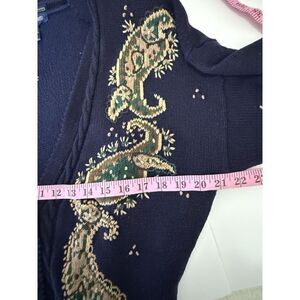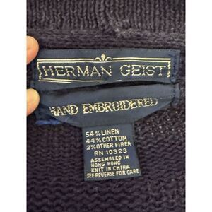 Vtg Herman Geist Embroidered Sweater Cardigan Cotton Linen Granny Cottage knit Medium navy cream paisley v-neck button cardigan granny core cottagecore teacher