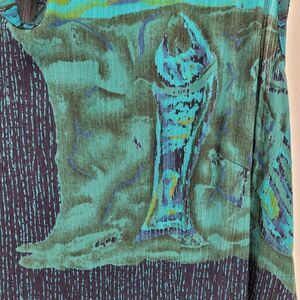 Asian Hawaiian Hostess Sleeveless Maxi Mandarin Blue Sz S. Vintage 70's 80's watercolor crinkle sleeveless mandarin split button cutout collar long double side slit Hawaiian hostess shift maxi in blue and greens back zipper entry by Hilo Hattie Island Collection.