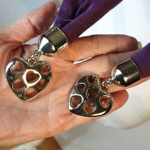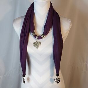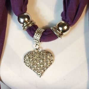 This vintage purple with silvertone hearts pendent measures approximately: 72" long. It has a silver tone heart and rhinestone pendent and silvertone heart ends. 100% acrylic and hand washable. In excellent preloved condition. All offers are welcome.