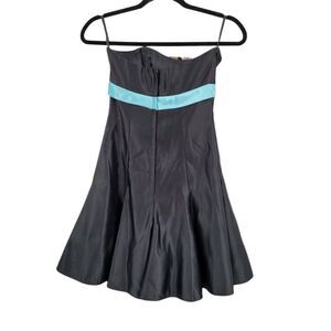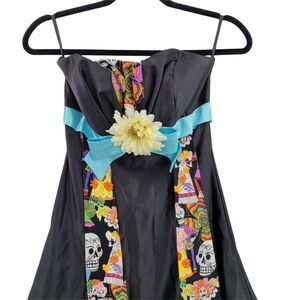 One of a kind upcycled vintage Gunne Sax Jessica McClintock strapless fit & flare mini dress with blue bow with added pleated sugar skulls ribbon and flower details.