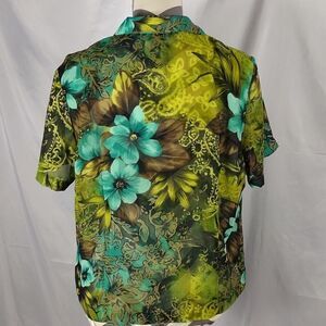 This vintage Koret green and teal floral, short sleeve, button down top is a size Petite Large. It is simi sheer and still has shoulder pads. 100% polyester and machine washable. Pre-owned and in excellent condition. All offers welcome.