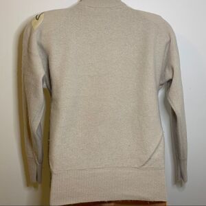 Description: Gently worn. Unique! Ribbed mock turtle neck. Long dolman sleeves. Front embellished with tonal faux snakeskin and faux leather appliques. Ribbed sleeves and waist.