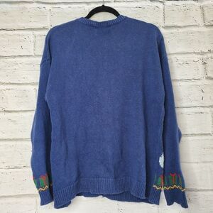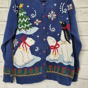 Vtg Northern Isles Cardigan Sweater Large Blue Christmas Snow Village Hand Knit.