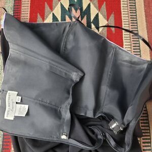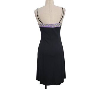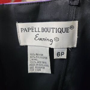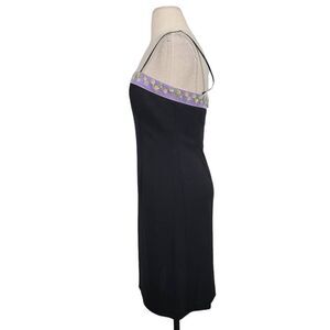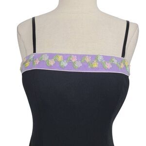Vintage Papell Boutique Evening Black Sheath, ribbon spaghetti Straps, Purple Chiffon 3D Dainty Floral square Neckline, back zip closure, boning on sides with interior hook and loop closure, Knee Length, stretchy, Rayon Polyester blend, made in Hong Kong.