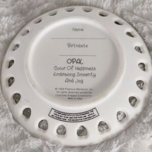 This porcelain vintage 1994 Precious Moments October Opal birthday mini plate measures approximately: 4" x 4". It has hearts cutout in porcelain. Comes with plastic plate stand. No chips, cracks or repairs. Pre-owned and in excellent condition. All offers welcome.