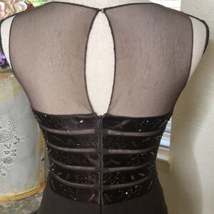 Gorgeous dress for a special occasion. Love the illusion back and sheer stripes that let a bit of you peek through. There is one missing bead in back, otherwise, in excellent condition.