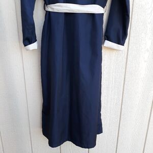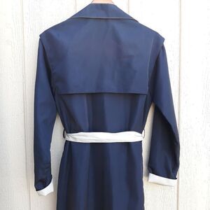Vintage raincoat midnight black with cream cuffs, collar and belt detailing long sailor back belted hidden button down trench. Feel is unbelievable.