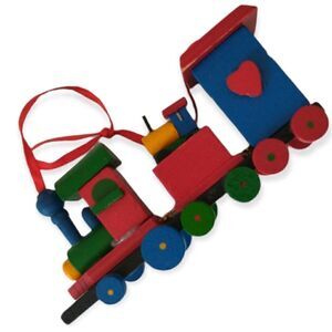 Vtg Wood Train Ornament Locomotive Christmas Primary Colors Painted Choo Choo. Condition is pre-owned and vintage. No chips, or cracks. There is NO damage, the hot glue marks are how it was made...very normal for these types of vintage wood ornaments made in the 70s. Please see photos for detailed condition. Unbranded.
