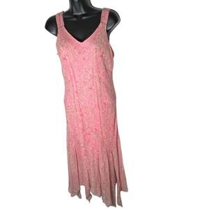 Vintage 90s Y2K Jonathan Martin Silk Sheer Chiffon Pink Paisley Asymmetrical Handkerchief Hem Drop Waist Cut on Brian fir a perfect custom Drapey Stretchy to form to your body Midi Dress with V Neck And Tank Sleeveless Straps