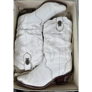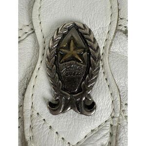 Step out in bold Western style with these vintage Zodiac USA white leather cowboy boots, size 7.5M. These boots feature intricate stitching, detailed metal toe and heel accents, and signature Zodiac star medallions. Made with quality craftsmanship.