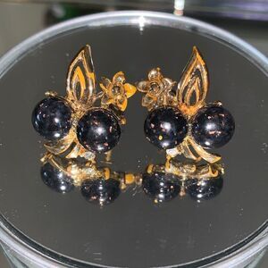 Vintage black flecked stone, rhinestones & gold screw back earrings