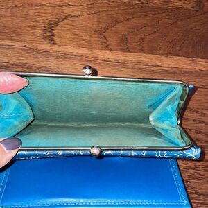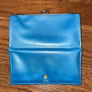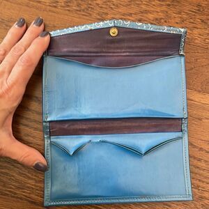 Vintage mid century ladies pearlized cowhide blue wallet with snap top coin case & 2 compartments for money & credit cards, etc