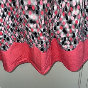 Vintage mid century homemade/handmade pink, black & white polka dot cotton apron with pink scalloped hem