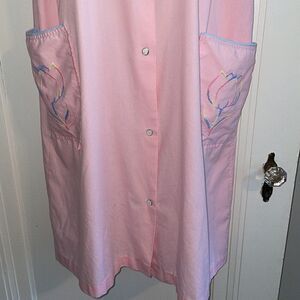 Vintage pink polyester/cotton blend robe/house dress with tulips embroidered on front pockets & light blue trim