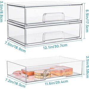 🧿[Stackable Design] Come with 2 drawer storage organizers, the outside box measures 7.5"D x 12.1"W x 3.5"H,the drawer measures 7.2"D x 11.6"W x 2.5"H,it is usable size.The storage containers are stackable, vertical storage will save a lot of space. You can also use them side by side. Put your small objects on top of acrylic bins to make your countertop space more tidy.