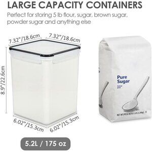 🧿Perfect for Storing Dry Food ---- The size of each container is 7.5 x 7.5 x 9.1 inch ( 5.2L / 175 oz) , with the large capacity, these kitchen storage containers are perfect for many kinds of dry food and baking supplies, such as flour, sugar, rice, grain, chips, cereals, nuts, beans, snacks, pasta, coffee and tea. Plus wide enough openings to reach in with measuring cup.