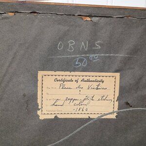 The frame has a few nicks and scratches. A couple of small stains on the print (see pictures). The black paper on back is torn.