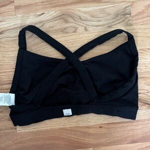 Sleek black sports bra with cross-back design. Ideal for active wear.