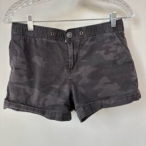 Button closure, gray, missing drawstring, crease marks, multiple pockets, still a ton of life left!