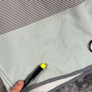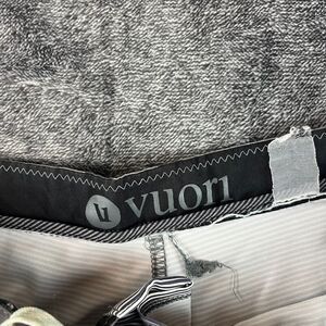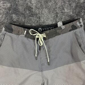 Vuori Cruise Board Shorts Striped Camo Drawstring Unlined Men's M/L 8" Inseam. **Some minor staining near bottom of board shorts as shown in photos and some wash wear on back of board shorts. Size has worn off; measurements are consistent with a size M/L. Refer to all photos for condition and sizing.