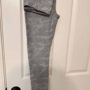 Stylish Vuori leggings with a subtle camo pattern. Soft and comfortable fabric. Perfect for workouts or casual wear.