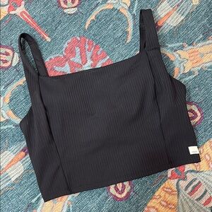 Sleek black ribbed crop tank. Square neckline with wide straps. Stretchy, form-fitting fabric. Minimal, modern style. Versatile for workouts or casual wear.