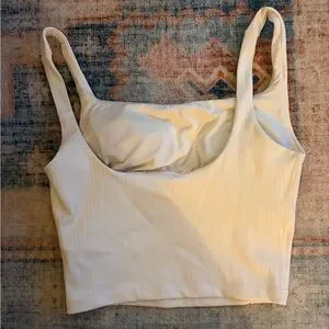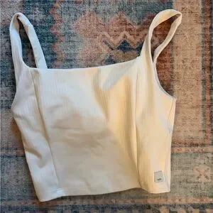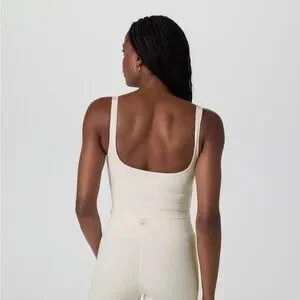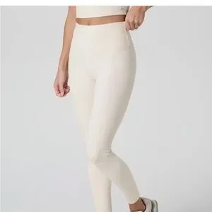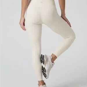 Stylish cream ribbed workout set. Includes a tank top and leggings. Perfect for fitness and casual wear.