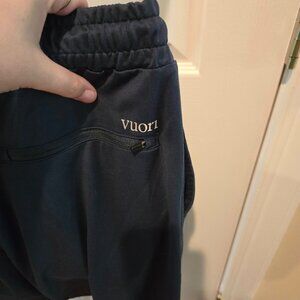 Vuori Men's Sunday Performance Jogger Size Small - great preowned condition, minimal wear from use, no major flaws. Ink heather blue color. Can also be worn by women. Fresh take on athleisure and staple in the wardrobe. Casual wear or athleisure, athletic wear. Workout pants. Sunday performance joggers. Drawcord in white/cream, elastic cuff, elastic waistband, moisture wicking, zip pocket. V logo on the front, vuori written on the back. Zipper pocket on the front with side pockets and the back has two zipper pockets. All functional.
