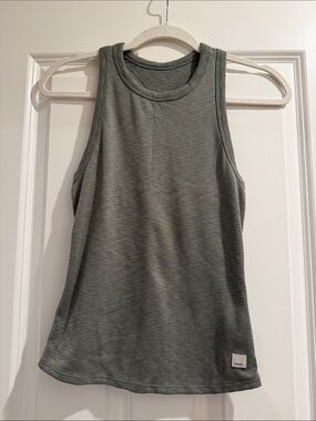 Sleeveless ribbed tank with a high crew neckline. Soft knit fabric for comfortable wear. Subtle brand patch at hem. Streamlined racerback cut for ease of movement.