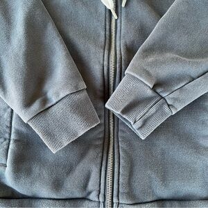 Vuori Restore Oversized Full Zip Hoodie. Women’s size XS. Color is a Washed Dark Gray, meant to look faded. Thick, organic cotton with a soft brushed feel, full zip closure, pockets at sides, thick drawstrings at hood. Meant to be longer and oversized. Super cozy and comfy. This particular style isn’t available on the website anymore.