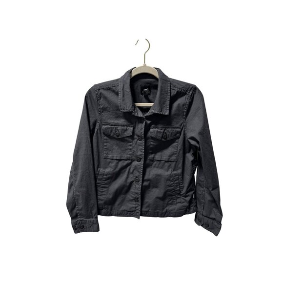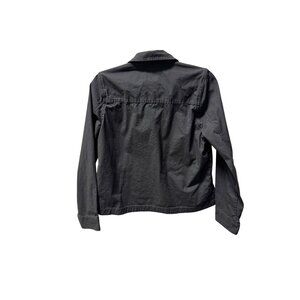 Stylish black button-up jacket. Features front pockets. Perfect for layering.