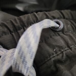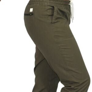 Vuori Vintage Ripstop pants FEATURE casual style slim fit and bottom hems that can be worn cuffed or full length. Hem is raw cut with stitch in place to avoid fraying. Mid rise waist. Slash side pockets. One welt and one zippered pocket in back. Drawstring waist.