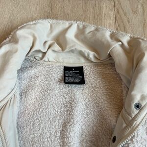 Cream colored women’s Vuori Sherpa jacket. Size medium. In excellent condition. Zip and snap closures, with two zippered pockets.