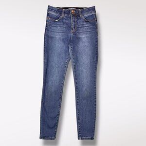 Dark-wash skinnies with a high rise and comfy stretch. Double-button waist and ankle length; easy everyday pair.