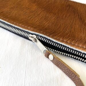 MATERIALS - Natural hair-on cowhide leather. Leather wristlet strap and zipper pull.