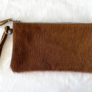 A "WG cowhide wristlet" rustic, western-style Cowgirl vibe clutch made from genuine hair-on cowhide leather, handcrafted by Wild Goose. Has natural brown and white hair pattern, leather wrist strap & zipper closure; product blends cowhide with leather for a durable, stylish accessory. Interior lining smooth knit-like black fabric.