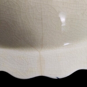 Preowned - Overall heavy age crazing throughout glaze. Two hairline cracks visible (one interior, one exterior). Small chip along rim (see photos).