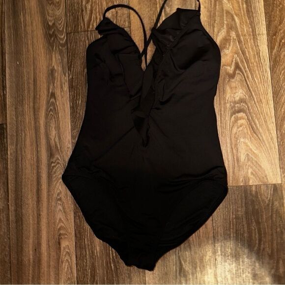 W SWIM one piece, deep plunge ruffle black size 12
